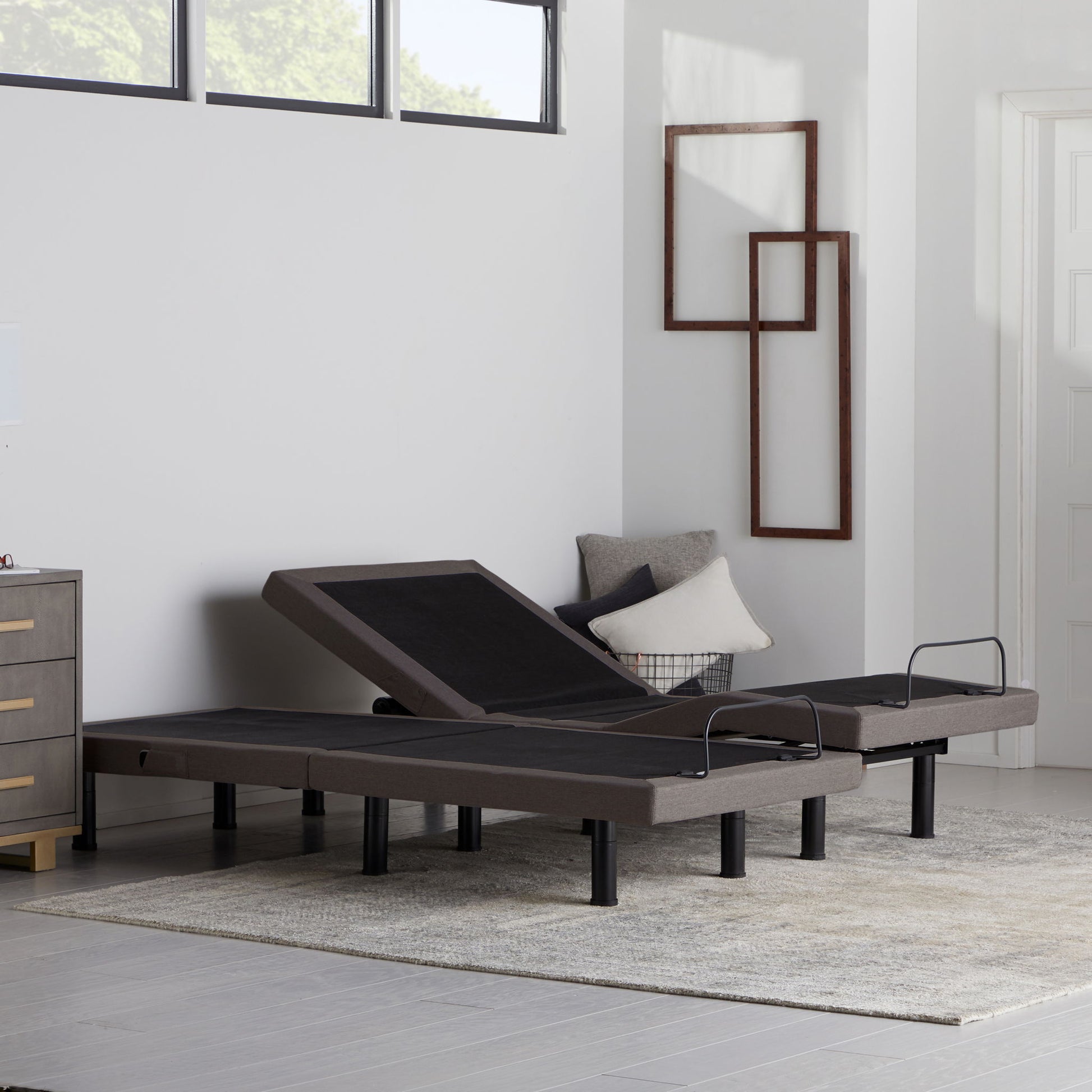 The E455 Adjustable Bed Base combines luxurious sleep with the health benefits of sleeping elevated for the perfect night’s rest. With an independent head incline up to 60 degrees and a foot incline to 45 degrees, your comfort is customizable. The base comes with three preset positions (Zero Gravity, Anti-Snore, and Flat), and two programmable positions can be personalized and saved. Studies have shown that sleeping elevated can help relieve back pain, ease sleep apnea and snoring, and reduce acid reflux and heartburn. Built-in Bluetooth® makes it easier to customize your sleep preferences with the MALOUF® Base app (Android and iOS), which includes Siri Shortcut voice commands built-in with iOS 12 and newer. Your bed can be operated with your phone or the included backlit, wireless remote control. Plus, you’ll never need to leave your bed—it's got charging ports on both sides. The sleek, lined-inspired upholstered frame in Stone looks great on its own or fits into most existing bed frames. Since it’s true zero clearance, it can sit directly on foundations, platform bases, slat beds, or the ground.
