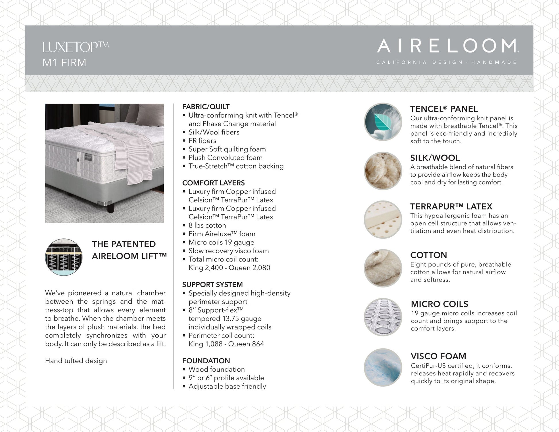 The Preferred Luxetop M1 Firm is a firmer version of Aireloom’s standard luxury mattress from the Preferred Collection. It is handmade and combines 3 of Aireloom’s superior components: the patented Aireloom Lift, Luxury Firm Celsion TerraPur Latex, and Firm Aireluxe foam. It conforms to your body and aligns your spine to minimize sleep disturbance.