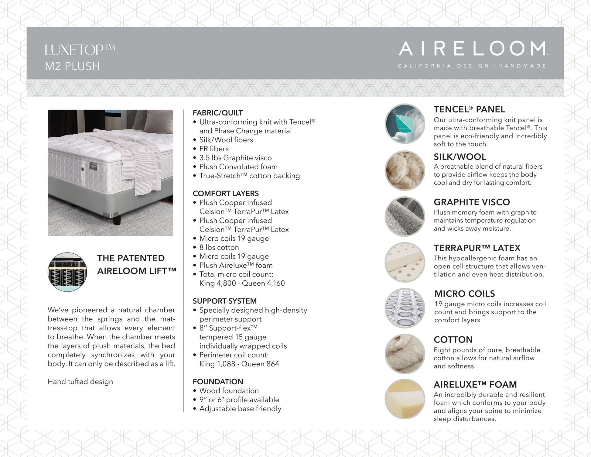 The Luxetop M1 Plush is the standard luxury mattress from the Preferred Collection by Aireloom. It is handmade with the patented Aireloom Lift, Plush Celsion TerraPur Latex and Plush Aireluxe foam. The comfort layers hug your body while ensuring stability and support for ultimate relaxation.