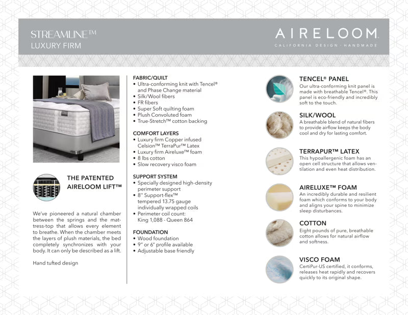 The Streamline Luxury Firm model in the Aireloom Preferred Collection is a supportive mattress while offering enhanced comfort, support, and pressure relief. This is a result of Aireloom’s commitment to quality materials and craftsmanship, producing mattresses “like they used to.” Experience the difference in Aireloom’s hand-tufted mattresses, combining quality materials like latex, silk, wool, cotton, and more. It’s no wonder why Aireloom mattresses are some of the longest lasting mattresses made today!